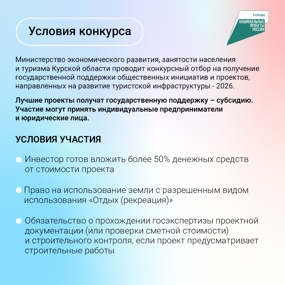 Отбор проходит в рамках национального проекта «Туризм и гостеприимство». Подробнее - в карточках.